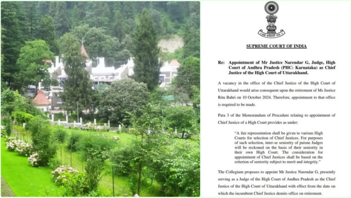सुप्रीम कोर्ट की कॉलेजियम ने की सिफारिश। कॉलेजियम ने माना है कि वर्तमान में कर्नाटक उच्च न्यायालय का उच्च न्यायालयों के मुख्य न्यायाधीशों में कोई प्रतिनिधित्व नहीं है। न्यायमूर्ति नरेंद्र जी उत्तराखंड उच्च न्यायालय के मुख्य न्यायाधीश के रूप में नियुक्त होने के लिए उपयुक्त हैं। इसलिये 10 अक्टूबर 2024 को उत्तराखंड हाईकोर्ट की मुख्य न्यायधीश न्यायमूर्ति रितु बाहरी की सेवानिवृत्ति के बाद न्यायमूर्ति नरेंद्र जी को उच्च न्यायालय के मुख्य न्यायाधीश के रूप में नियुक्त किया जाए। उत्तराखंड हाईकोर्ट के नए चीफ जस्टिस के बारे में जानें न्यायमूर्ति नरेंद्र जी का जन्म 10 जनवरी 1964 को हुआ है।उन्होंने बैचलर ऑफ आर्ट्स और एलएलबी में स्नातक की पढ़ाई पूरी की और 23 अगस्त, 1989 को बार काउंसिल ऑफ तमिलनाडु में एक वकील के रूप में नामांकित हुए। 1989 से 1992 तक मद्रास उच्च न्यायालय में प्रैक्टिस शुरू की। वर्ष 1993 में उन्होंने अपना पंजीयन कर्नाटक स्टेट बार काउंसिल में स्थानांतरित किया।
