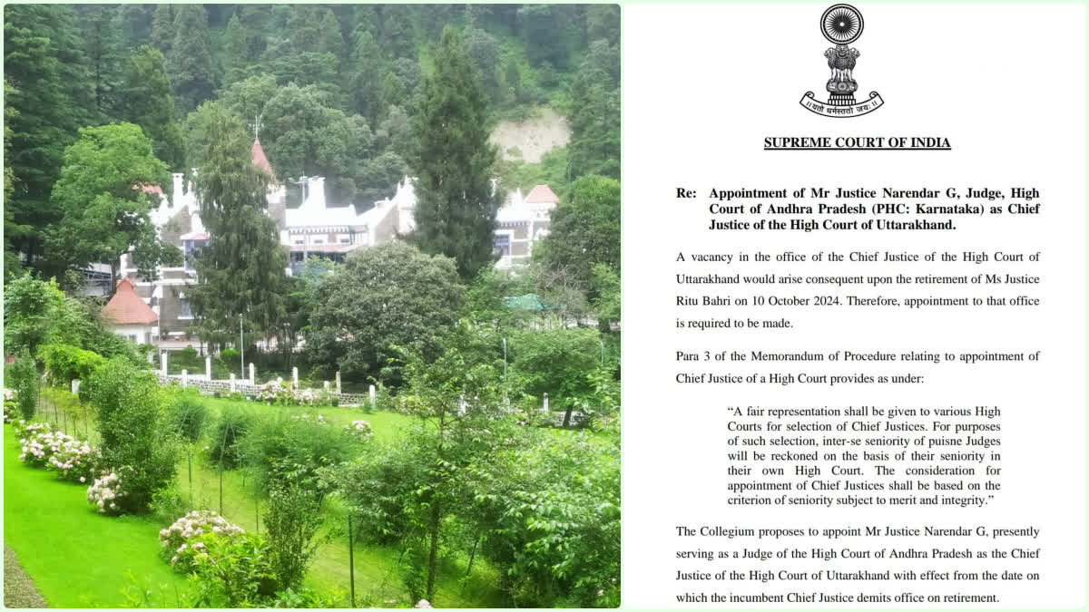 नैनीताल। सुप्रीम कोर्ट के मुख्य न्यायधीश डी वाई चंद्रचूड़ की अध्यक्षता वाली कॉलेजियम ने आंध्र प्रदेश हाईकोर्ट के न्यायाधीश नरेंद्र जी को उत्तराखंड हाईकोर्ट का मुख्य न्यायाधीश बनाने की सिफारिश की है। उत्तराखंड हाईकोर्ट की वर्तमान मुख्य न्यायाधीश रितु बाहरी 10 अक्टूबर को सेवानिवृत्त हो रही हैं। न्यायमूर्ति नरेंद्र जी की नियुक्ति 10 अक्टूबर से प्रभावी मानी जाएगी। जस्टिस नरेंद्र जी होंगे उत्तराखंड के नए मुख्य न्यायाधीश सुप्रीम कोर्ट की कॉलेजियम ने मंगलवार 24 सितम्बर को यह सिफारिश की है। न्यायमूर्ति नरेंद्र जी का पैतृक हाईकोर्ट कर्नाटक है और वे कर्नाटक हाईकोर्ट के वरिष्ठतम न्यायाधीश रहे हैं। उनकी नियुक्ति 2015 में कर्नाटक हाईकोर्ट में हुई और 10 अक्टूबर 2023 को आंध्र प्रदेश स्थान्तरित हुए थे। उच्च न्यायालय के न्यायाधीश के रूप में पदोन्नत होने से पहले, उन्होंने कर्नाटक उच्च न्यायालय में वकालत की। वह कर्नाटक और आंध्र प्रदेश हाईकोर्ट में न्यायिक और प्रशासनिक पक्षों में काफी अनुभवी न्यायाधीश हैं।